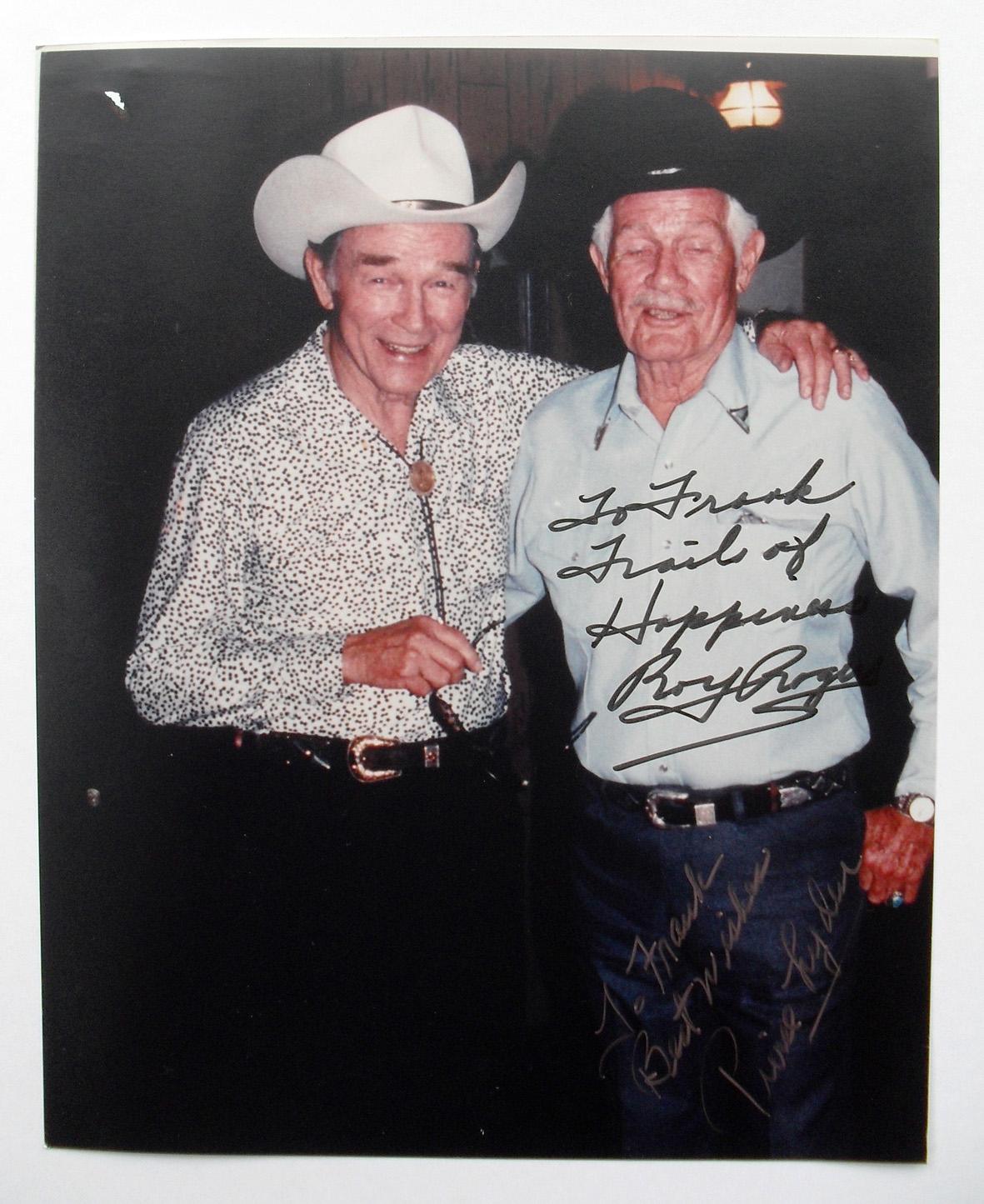 Colour 8 x 10 photograph authentically signed by Rogers in black Sharpie ‘To Frank Trails of Happiness Roy Rogers’ and in white Sharpie by Lyden ‘To Frank Best Wishes Pierce Lyden’ Apart from a very slight imperfection on the top left of the photograph, the item is in a near fine condition. Coincidentally, the seller met Pierce Lyden in Hollywood in 1990.