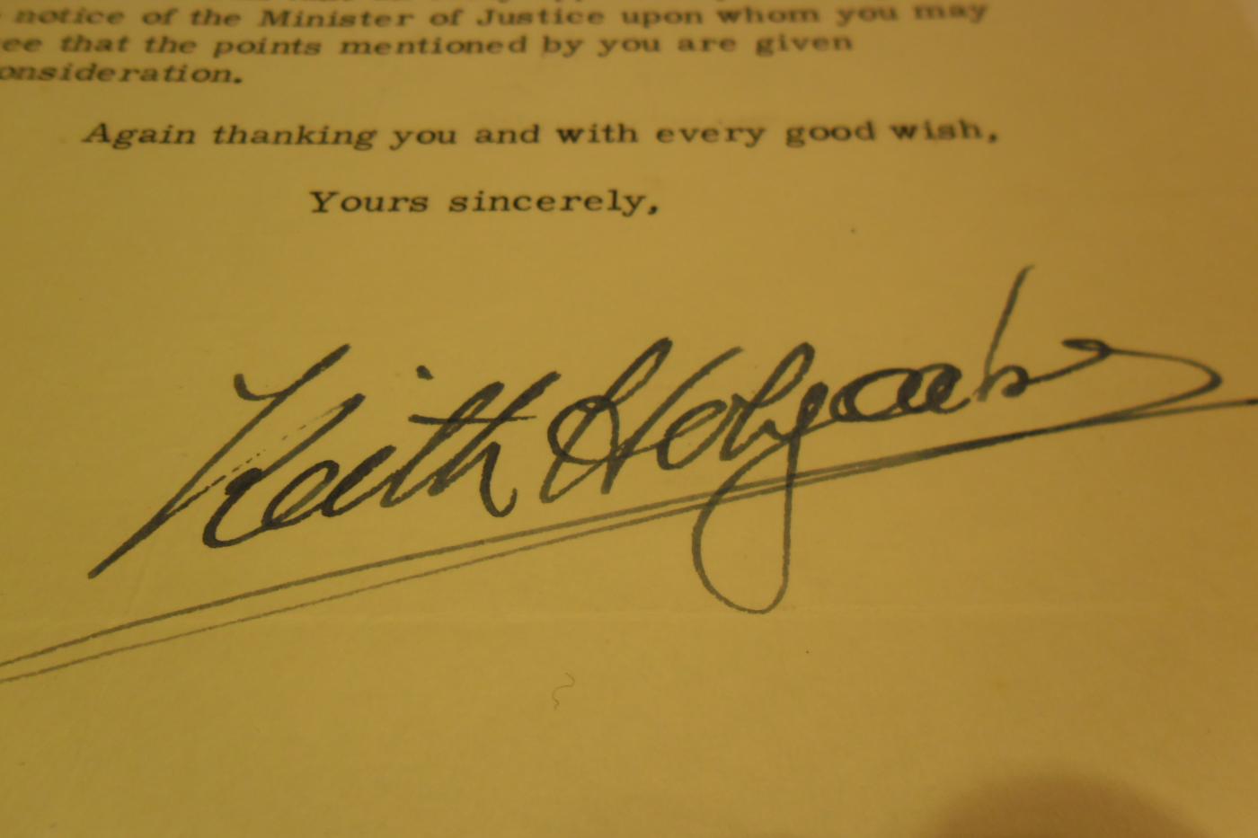 Cut down typed letter on Prime Ministerial letterhead boldly signed by Sir Keith Holyoake on 8 December, 1969.