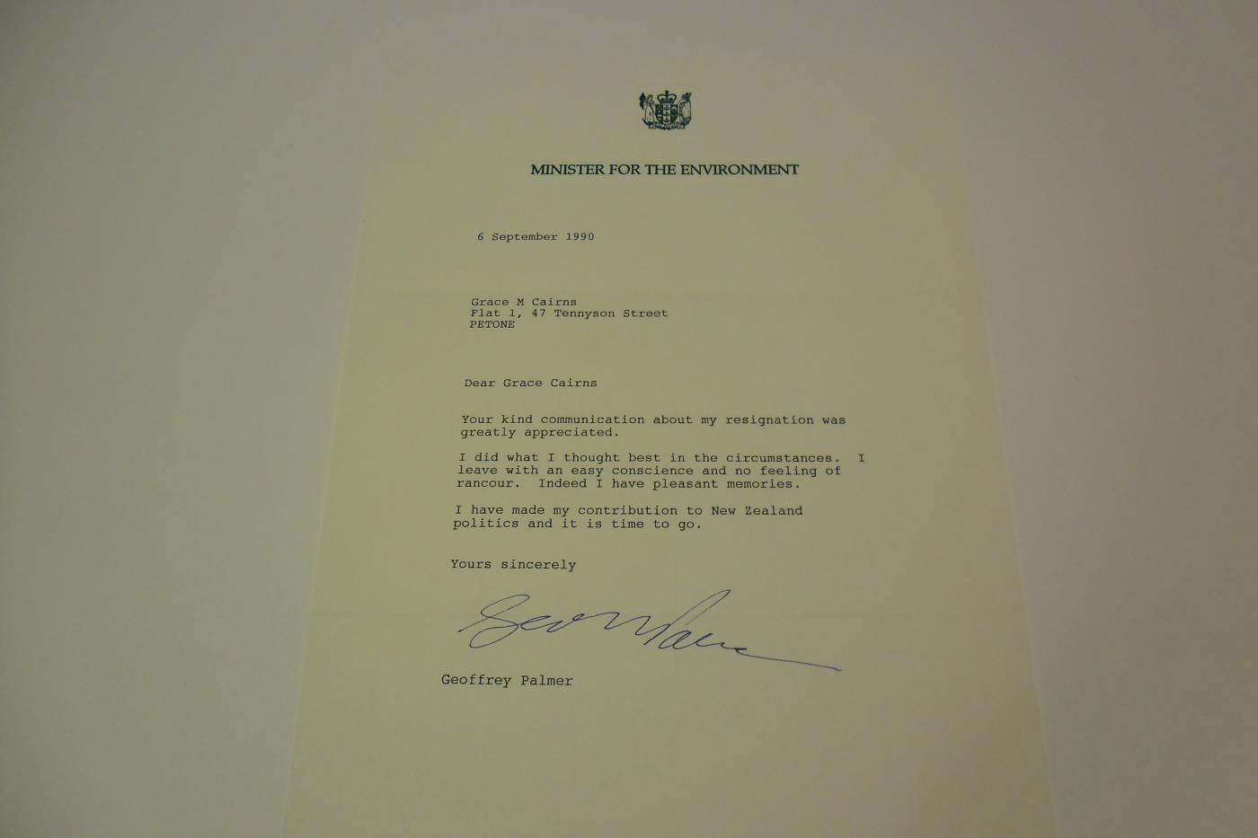 A4 typed letter dated 6 September, 1990 on Minister for the Environment letterhead, signed by Palmer.