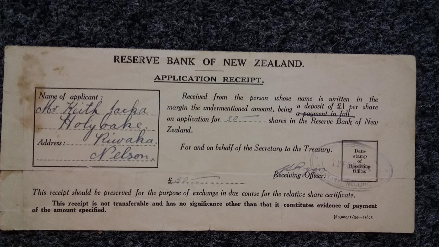 - Reserve Bank of New Zealand Application Receipt being a deposit of 1 pound per share on application for 50 shares in the Reserve Bank of New Zealand dated 12 February, 1934 made out to Mr Keith Jacka Holyoake of Riwaka, Nelson.