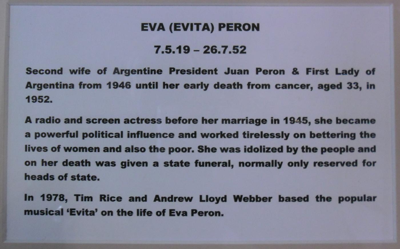 Eva (Evita) Peron (1919-1952) was the second wife of Argentine President Juan Peron and First Lady of Argentina from 1946 until her early death from cancer, aged 33, in 1952.